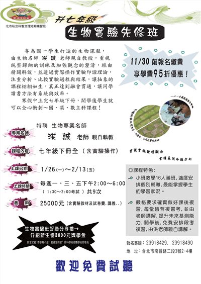專為國一學生打造的生物課程 生物名師 洪誠 老師親自授課 打通孩子的任督二脈 生物高分輕鬆獲得 小班教學 報名要快! 11/30前報名繳費 可享學費95折優待